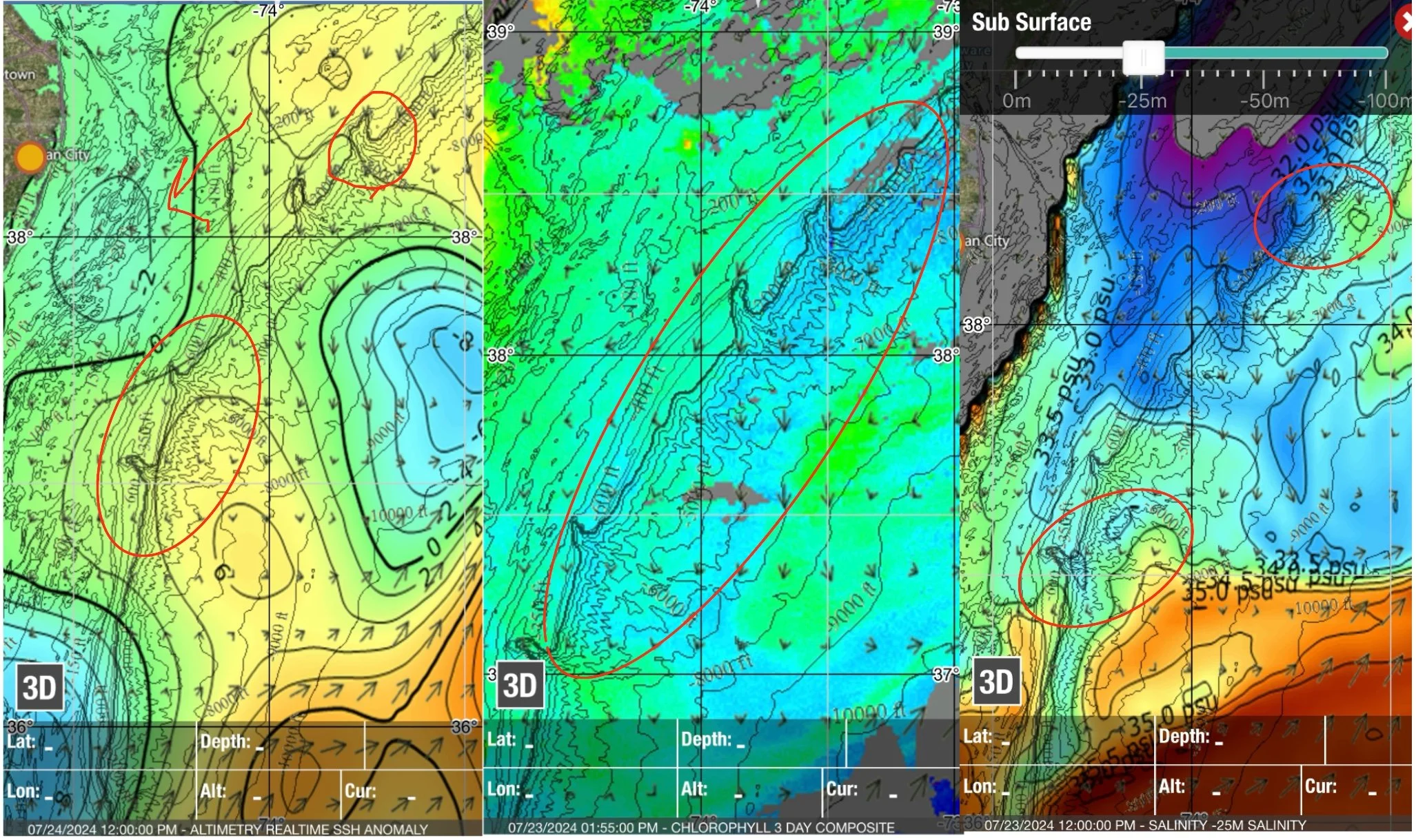 Finally it appears like the weather is gonna cooperate this weekend! Thursday-Sunday is looking beautiful for anyone fishing this weekend or fishing in the Huk Big Fish classic this weekend! At the moment the Norfolk is still looking the best, but that eddy is moving north which means the fishing in the Washington could also be good! There’s another eddy pushed inshore for the inshore guys, anywhere in the deli looks good, Chicken Bone, Hambone, Sausages, even Hot Dog and Jackspot look like they should be holding life! Then another nice eddy about 15-20 miles east of the Baltimore that could be good for billfish. The eddy we were keeping an eye on to the north of the Wilmington fizzled out and changed directions but it could still be holding. Based off salinity the Norfolk still looks the best, with the Washington in a close second. The first picture to the left is showing altimetry, the middle photo is chlorophyll shot showing the band of blue water which is now covering almost every canyon in the mid-atlantic, then far right is Salinity, the areas I circled are the areas that look the best! Tight Lines! As always I will update this evening when I hear how boats who fished today did, and will def be keeping a close eye as we move towards the weekend!