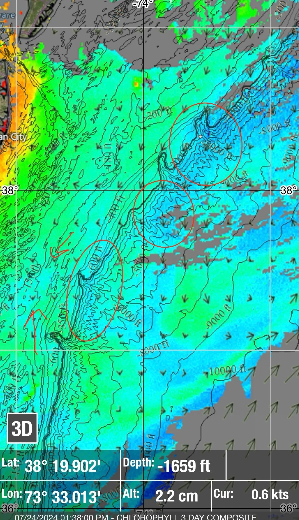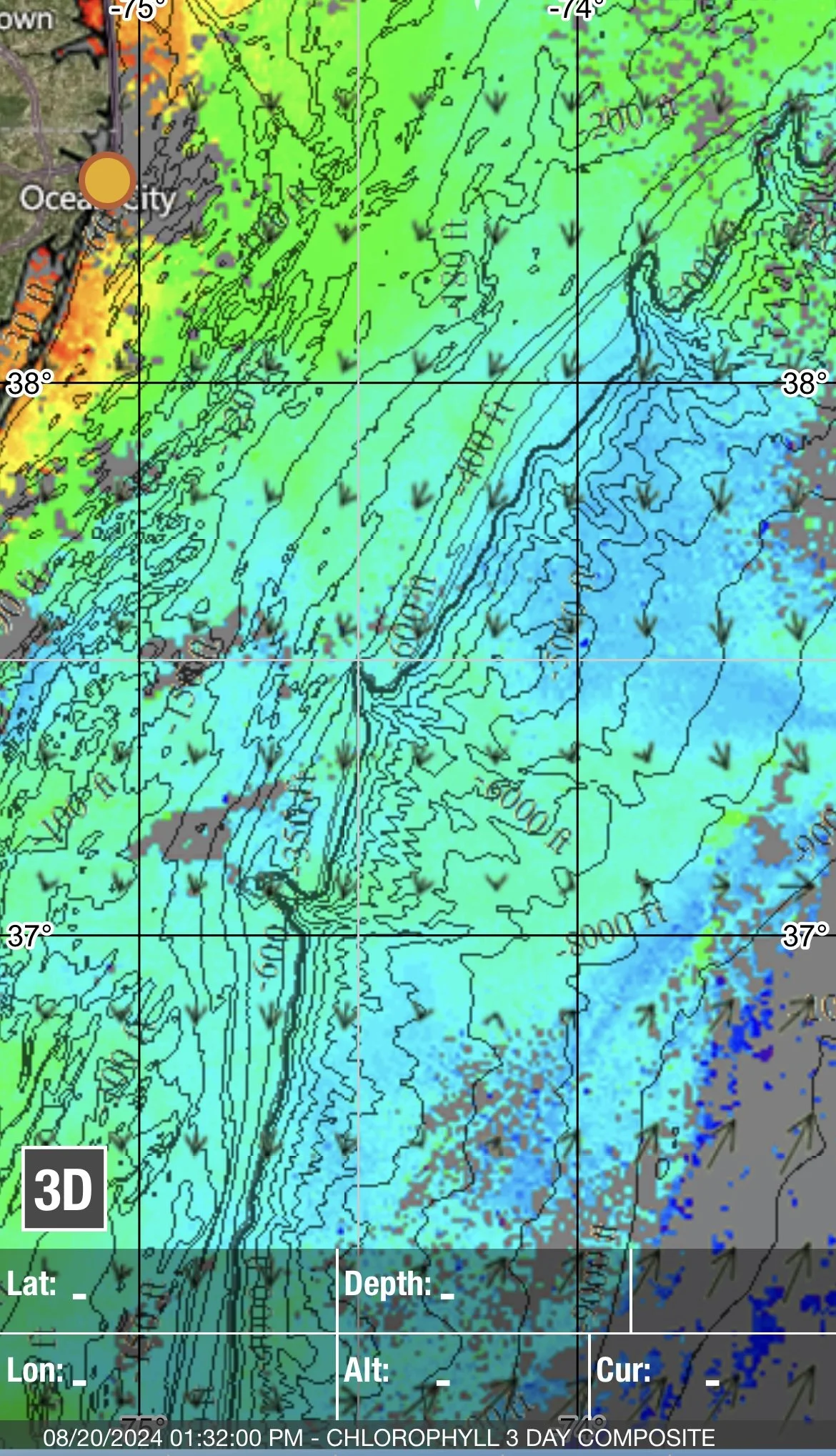 Last day of the 2024 WMO and the wind has laid out, the seas have calmed down, and boats are out fishing! Let’s see what comes to the scales here on the last day! I couldn’t wait to wake up and look at the sat shots this morning, but I was a little disappointed to see the water is still pretty unorganized out there. We still have the eddy that’s been up in the Wilmington area that is now pushing east back towards the gulf, however I believe there is plenty of good water still holding fish in and around Wilmington and Baltimore canyons, as far north as the Lindenkohl and Carteret. I guess I’ll have to wait to hear from Jeff and the crew, I believe they’re fishing in the Wilmington today so he will be able to tell me what the water looked like, and we’ll have a better idea for what this week holds once we can se tomorrows shots and data! Like I said at the moment unorganized and all over the place but Wilmington still looks like the best bet, maybe dumpsite east of Baltimore for billfish. Inshore looks very dismal, I don’t see any lumps that look like they’d be holding tuna, maybe if your in Cape May or DE Bay and can go to some of the northern lumps like the Lobster Claw (38° 50.425’ 73° 34.68’) or 40 Fm Fingers (just east of Lobster claw) good luck and tight lines!