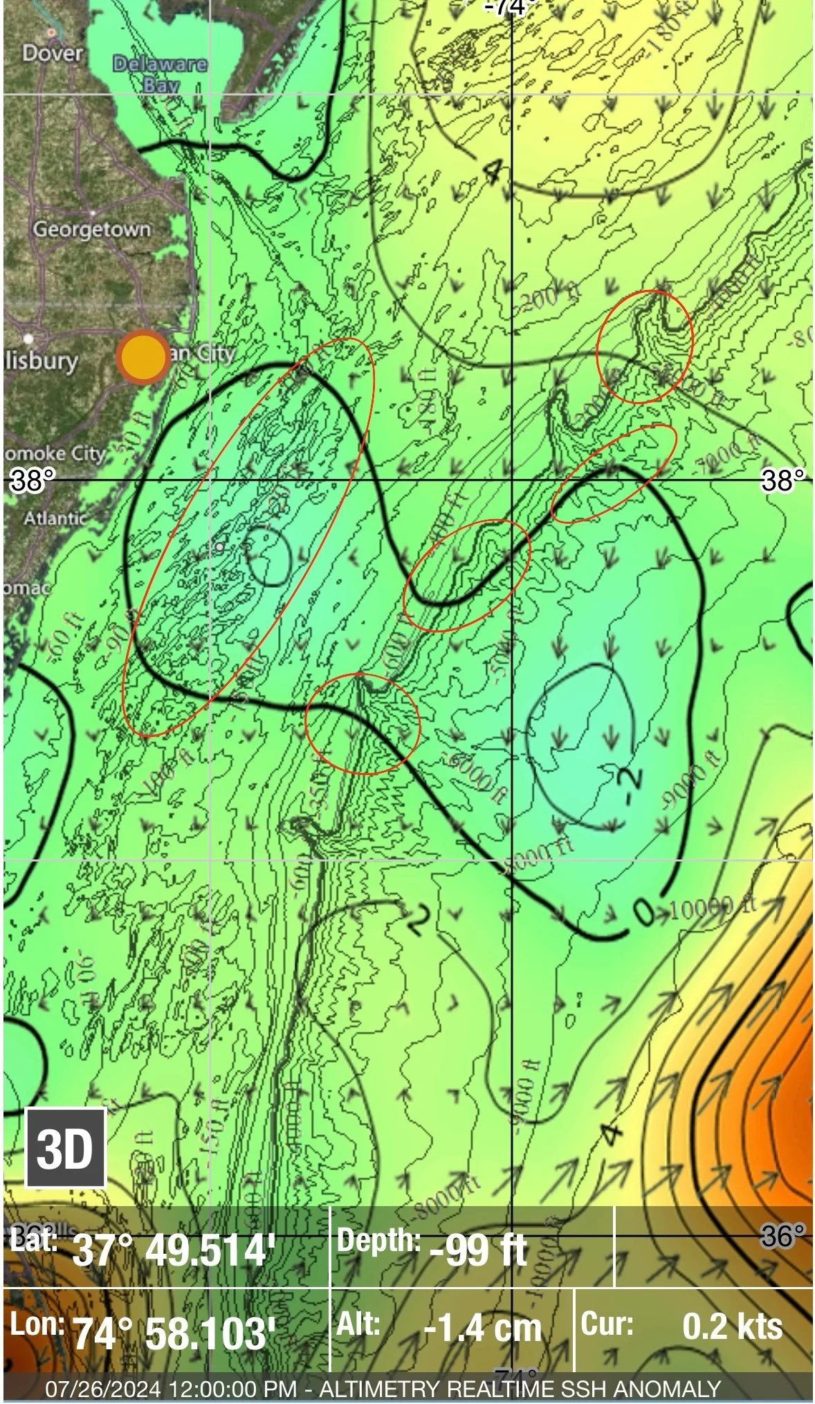 It’s that time of summer! Where you start seeing all kinds of different boats from all over showing up here in Ocean City for the wordless richest Bill Fish tournament the White Marlin Open! As of right now Thursday and Friday morning look like good weather however the wind will build out of the south throughout the day and be 15-20 out of the south by 2-3pm. Just as predicted yesterday that eddy has condensed and landed smack dab over the Baltimore, which could make for some awesome fishing! It has actually sort of split into two eddies one in the Baltimore, and one just east of the Poormans, the one outside Poormans reaches the Washington as well so anglers will have some options this week and be able to spread out a bit. There’s still some very blue water in the Wilmington, as well as a nice piece of blue water in the Baltimore, Baltimore is now looking like the best option, with Wilmington and Poormans in a close second place. Inshore also looks like a good little piece of water right in front of OC, spots such as Massey’s Canyon (38° 19.750’ 74° 26.500’) or Chicken Bone (38° 14.200’ 74° 26.590’) should be holding life! Tight Lines and we will check in later this afternoon or tomorrow morning! We are thinking of doing some billftshing tomorrow so will keep you all posted on that as well! If we do go we’ll most likely go somewhere between the Washington and Baltimore!