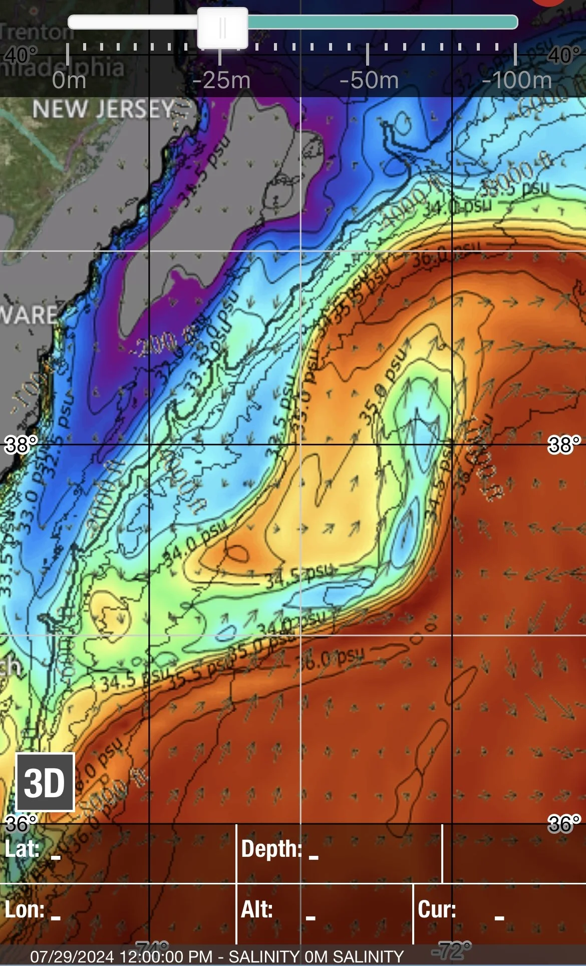 Soon as I mentioned good weather, it turns around and is rainy and overcast all today, go figure! The weather is still looking decent for this weekend though as far as fishing goes. Looking over shots from today the water has shifted more than expected, there is some really blue water in the Wilmington, could be good for anything from big eyes to blue marlin, there’s a large eddy east of the Baltimore but the outer rings are passing through the mouth of the Wilmington, so with that really blue water I imagine there’s a decent amount of fish around too. We also can see the blue water that was in the Norfolk has pushed up into the Washington, and the eddy to the south is unfortunately getting sucked back towards the Gulf Stream, but is still plenty close enough to produce good fishing in the Washington and Norfolk. Remember blue water isn’t everything this time of year, and this funky year in general, we’ve had several reports of fish being caught in very green water, which is why we look at altimetry and salinity. Based off Salinity the areas that look best are the Wilmington canyon (particularly the north east corner of the canyon) and then the Southeast corner of the Norfolk canyon. I’m sure there is fish in almost every canyon the way it looks, the Washington would be 3rd on the list. I myself am very curious what the Wilmington is like right about now, but the Norfolk looks good too! Tight lines! We’ll see if anyone bring any fish to the dock today if they went out in the rain….