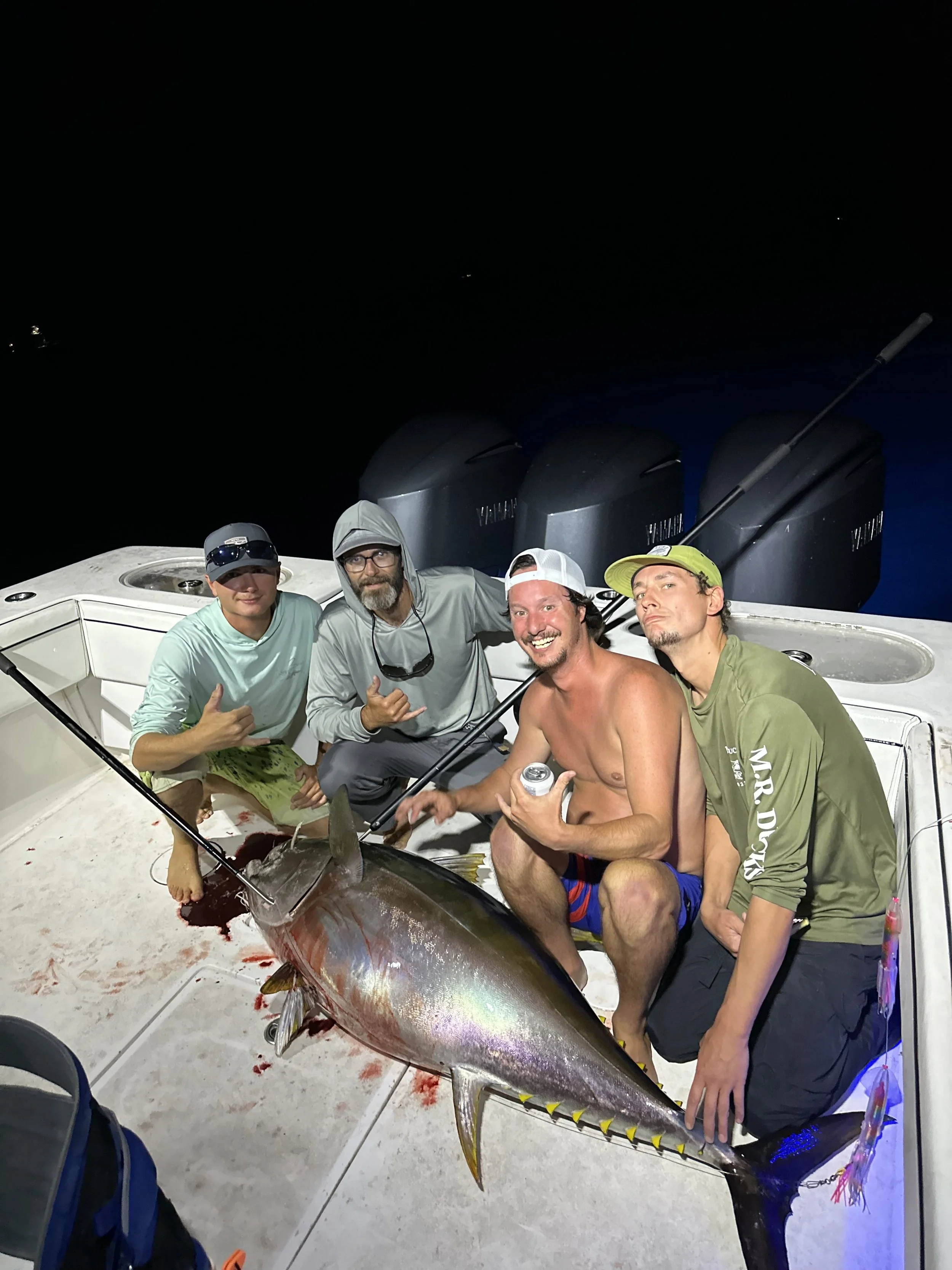 We set out yesterday on a for fun trip with the boys scouting for the Mid Atlantic 500 coming up, we waited till around noon to head out and went up north to the Wilmington in search of big eyes, we had heard they were around and the conditions looked proper as you saw in yesterdays report. As we were passing through the Hot Dog on our way we daw whales loaded up so we stopped and tried chunking for about an hour at the Hot Dog but no luck so we kept moving north and stuck to our game plan. We got to the Wilmington around 3-330 and immediately missed a marlin bite, then slowly picked away at a few skippys, but we had tons of good marks and the whales were all stacked up feeding, so around 530-6pm we pulled in the trolling gear and tried dropping some heavy jigs down on spinning rods, and to. our surprise Willie got tight 3 different times!!! Pulled the hook on all 3, knowing what we know now we are thinking they must of been big eyes and we just had to light of tackle to handle those beasts lol but after 45 mins of jigging, we went back to trolling for prime time. Patience was key, we trolled and trolled and waited and waited but soon as that sun went below the horizon about 8-815 BAM the big one we landed crashed on a daisy chain right behind the boat, then a second rod went off, and then a 3rd! The 3rd one missed the stinger but we were tight on two! Jamie and Willie got to work, Willie had his probably 50 feet from the boat when it decided to try and run one more time and a Sterling spreader bar failed and broke at a place where it def shouldn’t have, we were not happy about that to say the least but shit happens. After 20 mins Jamie was getting gassed (being his first tuna ever but he did great!) so I (Taylor) took over and 10-15 mins later we had it next to the boat and stuck a gaff in it! The one we landed was bigger than the one we lost and we only used about 17lbs of drag so there is no reason that bar should of broke the way it did, but we impressed ourselves getting the bigger fish to the boat in 30 mins! Hell of a night can’t wait to get out and do it again! There is also a nice band of blue water east of the Baltimore that’s holding mahi and billfish, and then the blue water we were fishing that stretches from the Spencer and goes down into the Wilmington and is slowly moving south. That water should stay in the Wilmington for at least another 2-4 days but we will be keeping a close eye on things as we get ready for the Mid Atlantic 500. Wilmington is def the place to be for tunas, Baltimore for mahi and billfish. Inshore guys, I’d try the Hot Dog, Parking Lot or Hambone, we saw lots of life t the Hot Dog and got a report of a wahoo caught trolling between Parking Lot and Hambone, there’s been quite a few wahoo around so that can be a fun fish to target for those fishing inside the 100 line! Good luck and tight lines y’all! Check back in tomorrow!