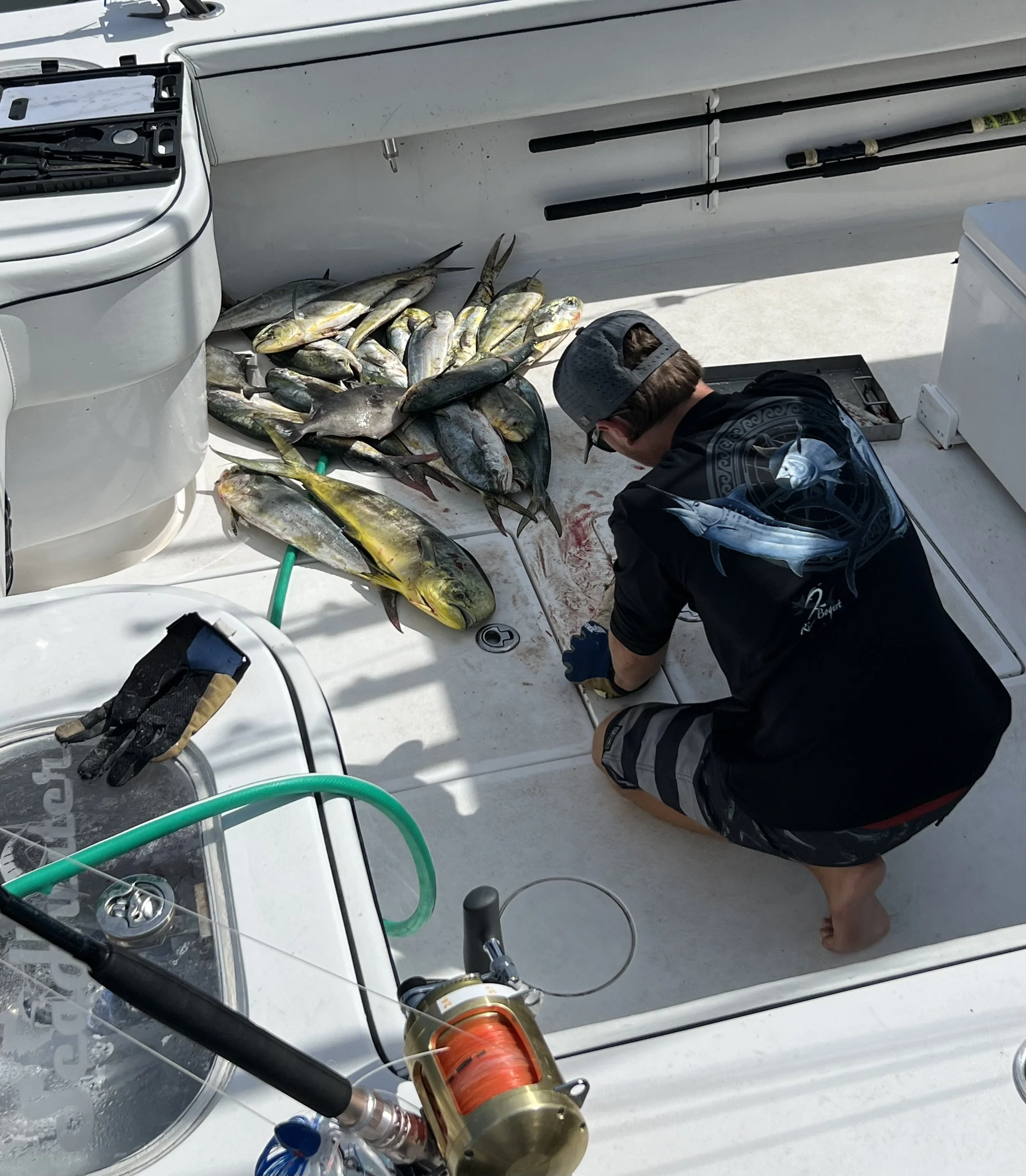 Well we got the boys together to attempt a repeat of last Thursday, however the big eye had different plans! We got to the Washington around 3pm and found a pot loaded full of mahi! We picked away at them for a good hour or two on light tackle and artificial jigs and paddle tails and had an absolute blast! We’ll post on the YouTube soon of all that action, Alex our mate even jumped in and speared a nice trigger and one nice mahi too! The whales were stacked up so we thought it was game on, we marked em good too, but they just wouldn’t come up to eat! We got word there was one big eye caught in the Wilmington yesterday, so seems like the blue water that is moving south down the 100 line into the Wilmington is probably the best bet for tuna, big eye in particular. The mahi seem to be everywhere, and the blue water in the Poormans looks good for billfish! Those are the two areas we are keeping an eye on at the moment, especially the Wilmington. Inshore lumps have been showing lots of life just no tuna, but lots of mahi and bonita around! Hot Dog, Hambone, Sausages, Parking Lot any of those lumps in the 15-30 fathom range should be holding plenty of life! Good luck and tight lines! We’ll talk to y’all tomorrow!