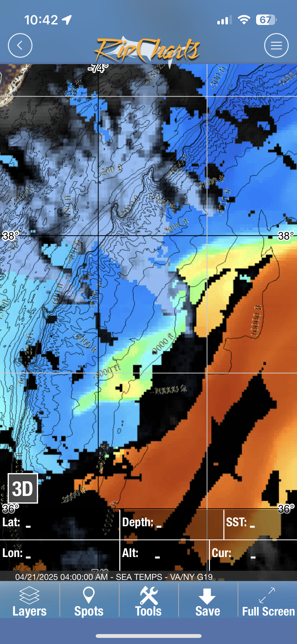 The water is finally within reach of the 100 line and our canyons! We are thinking by tomorrow it will be fully inside the canyons, chlorophyl shot is also showing some beautiful blue water to the south between Washington and Norfolk and sliding this way. Then there’s also some semi blue water up to the north east near Wilmington and Baltimore! We will have to make the call later tonight as to where we will be fishing tomorrow, I am thinking its gonna be a tough call, either Norfolk/Washington or Wilmington/Baltimore, but hopefully we will have a better idea later this evening as we are able to analyze todays shots, altimetry, salinity, chlorophyl and oof course SST’s will all play a factor as well as wind direction and current, when we make our decision we will keep you all updated! Things are starting to look good though, if you're ready to fish send it tomorrow with us! We’ll be available on StarLink through DM’s and iMessage or. on the VHF channel 8 or 18, tight lines and stay bent!!!