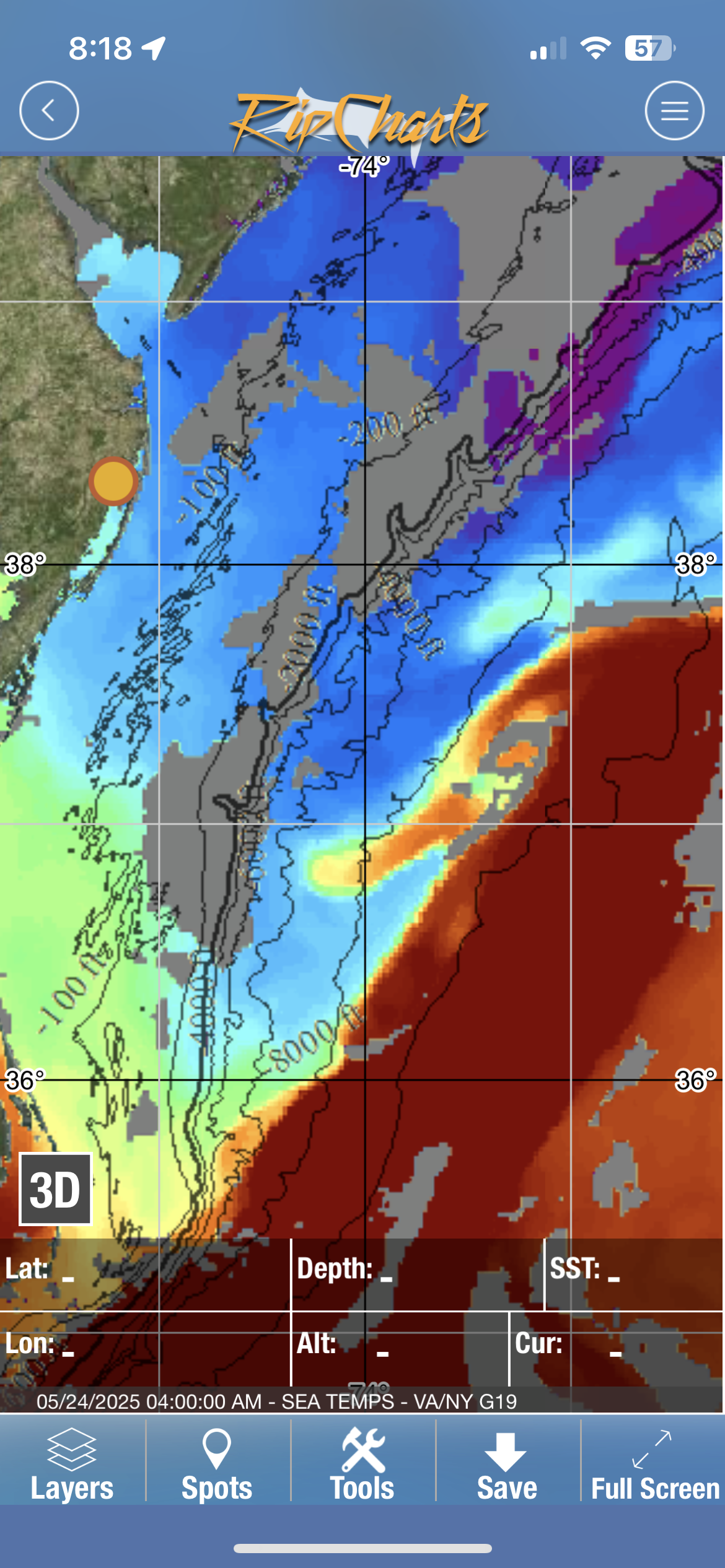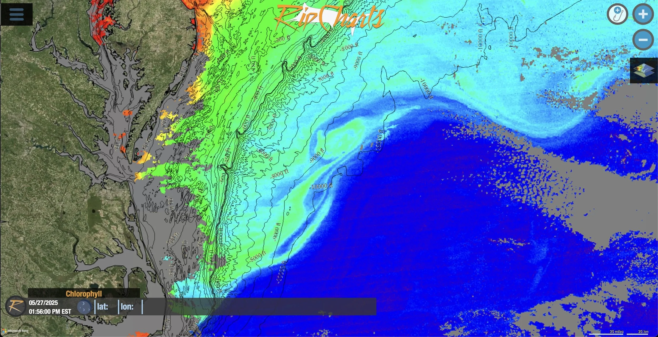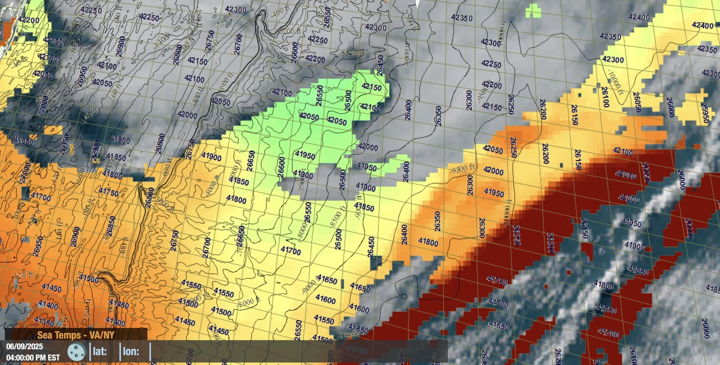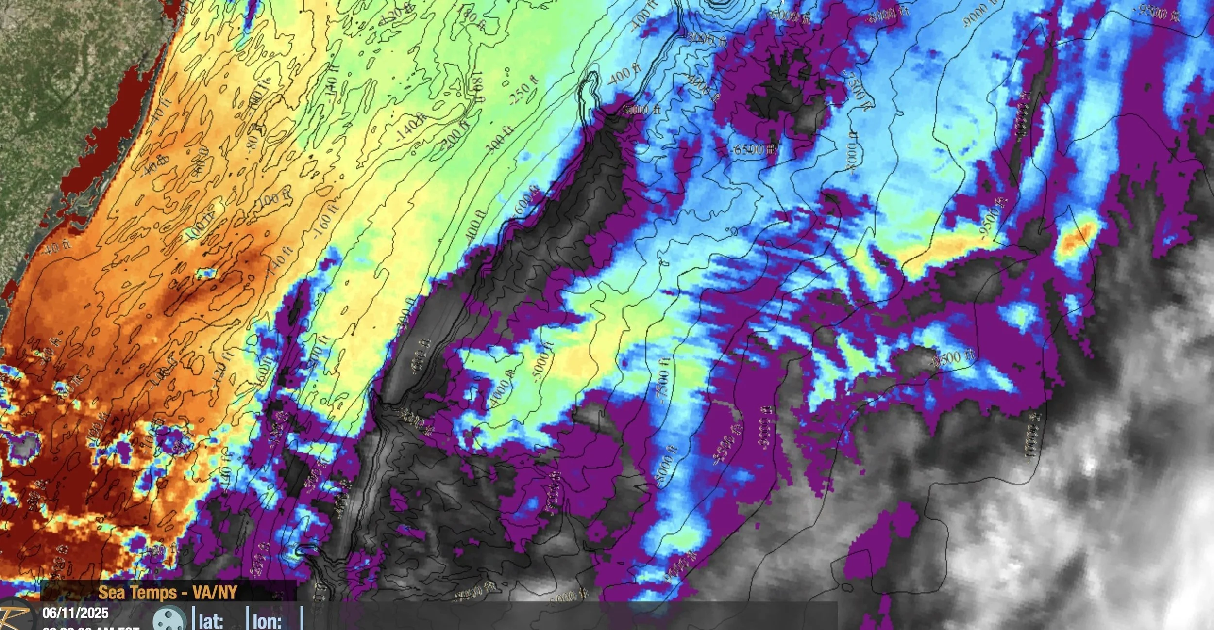 This is a 6.4.25 1am shot from a new imagery provider we got for the app we’ve been building more about that later! Another day and boats are making the trek to that eddy and it is continuing to produce great fishing, with boats catching both trolling and casting, we got all of our bites trolling on Monday and as we said they mostly ate the meat they were keyed in on the ballyhoos, we’ve also heard plastics are working well too. With the hurricane system to the south moving north towards the east coast it may shake the water up a bit, we’re also forecasted to have some easterly winds which also could help blow the eddy closer into the 100 line and canyons. When and if that happens the fishing will be lights out, it has continued to provide great fishing, yellowfin have been caught in that eddy everyday since last Saturday, we’ve been blessed with calm conditions and there’s been at least one or two boats or more that have made the trek, and not one has been skunked that we know of so that’s 5 days in a row of great fishing, hopefully a sign of a good summer of tuna fishing! As you members know (and new members you can go back through the history of our reports and see) we’ve been tracking and following this piece of water since mid May and already made the trek once as far back as April (that was a different piece of water) but this is our passion its what we love to do go out and hunt down these fish and figure out where they live what they eat where they travel, and then using tools like oceanography, SST Satellite imagery, chlorophyl shots, and other data we’re able to predict where these fish will be and we love sharing that with you all and helping each other out and get what edge us “little guys” can without using omni sonar or paying thousands of dollars for multiple different reports. So we have been working hard behind the scenes to build a user friendly app that takes all the specific data we use from all the other different sites and apps and puts it all conveniently in one place. Imagine google maps or OnX maps etc. but you can overlay SST, Chlorophyll, weather, commercial fishing activity, literally all the tools we use to make our reports and decide where we want to fish, you’ll have real time live data on everything you need for pelagic species and even bottom fishing and contour maps! It is gonna be awesome, and you guys our members are gonna be the only ones with access to the app! It won’t be available in the App Store or google play store, you’ll be helping us test it and give us feedback on how you like it or things we can change! Of course that’s all optional and these daily updates will still continue as normal, it will just be another added bonus for members who want to try the app and dive into oceanography and predicting where these tuna will be! The shot above is one of the multiple SST imagery providers we’ll be using! We are so stoked for this summer and seeing how good the fishing gets and how good our members do! We may compete in tournaments verse each other sometimes but at the end of the day were all one big team at Always Bent! Tight lines and Stay Bent!