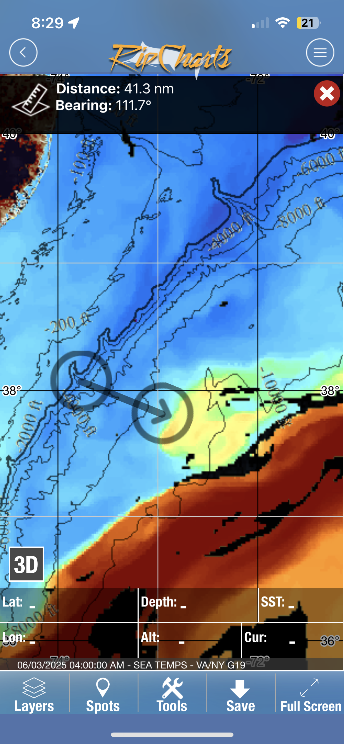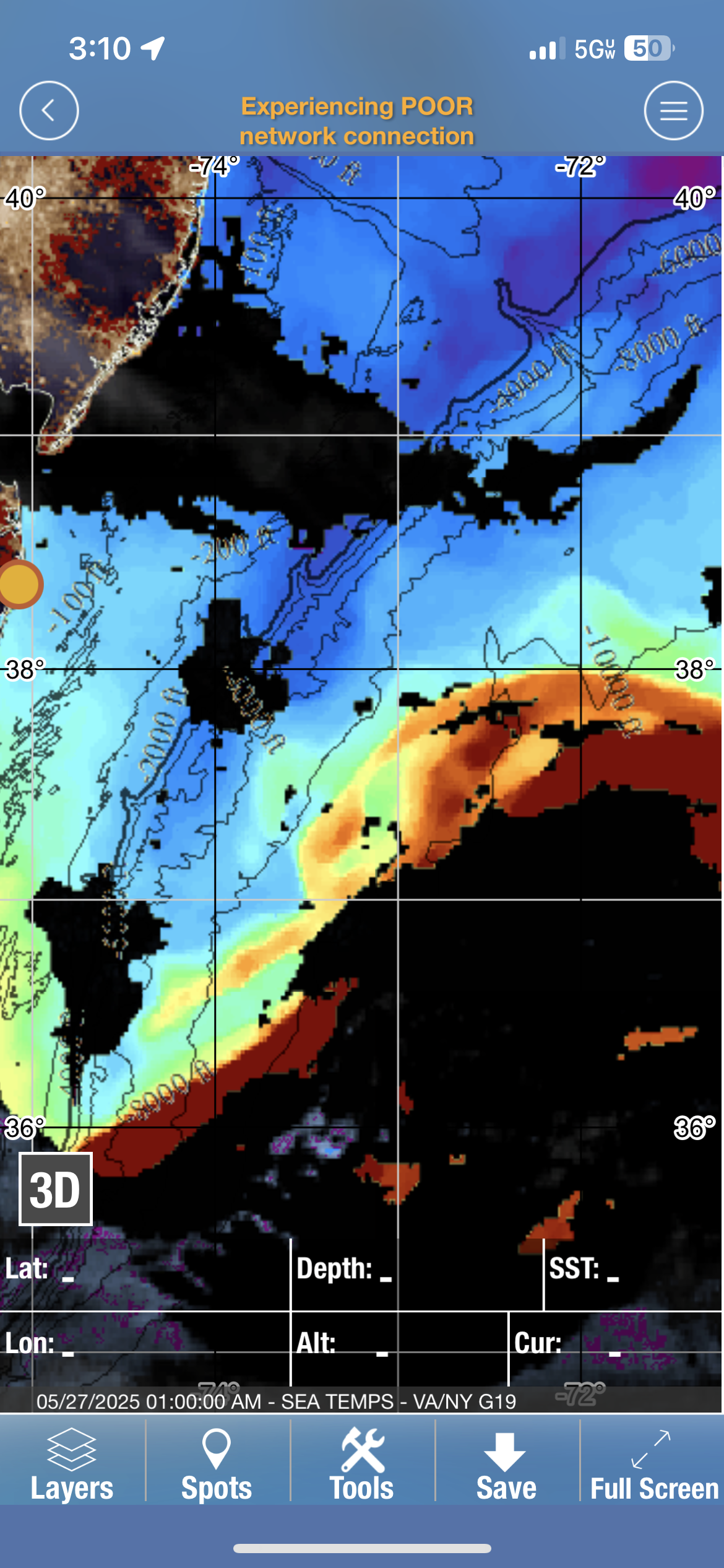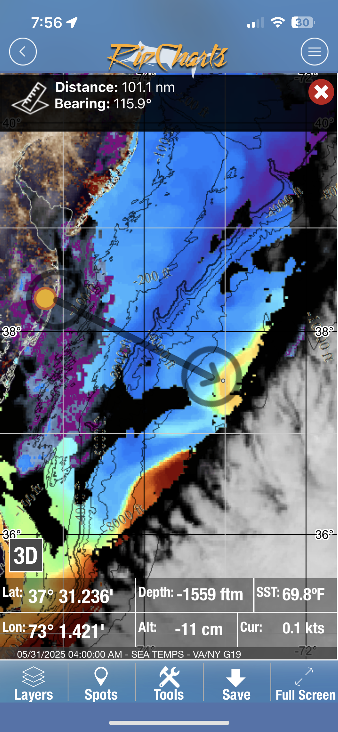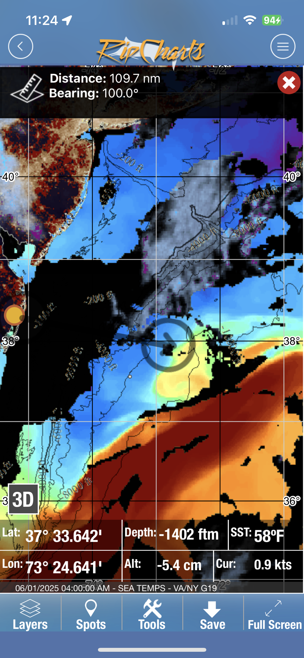 This is a 6.4.25 1am shot from a new imagery provider we got for the app we’ve been building more about that later! Another day and boats are making the trek to that eddy and it is continuing to produce great fishing, with boats catching both trolling and casting, we got all of our bites trolling on Monday and as we said they mostly ate the meat they were keyed in on the ballyhoos, we’ve also heard plastics are working well too. With the hurricane system to the south moving north towards the east coast it may shake the water up a bit, we’re also forecasted to have some easterly winds which also could help blow the eddy closer into the 100 line and canyons. When and if that happens the fishing will be lights out, it has continued to provide great fishing, yellowfin have been caught in that eddy everyday since last Saturday, we’ve been blessed with calm conditions and there’s been at least one or two boats or more that have made the trek, and not one has been skunked that we know of so that’s 5 days in a row of great fishing, hopefully a sign of a good summer of tuna fishing! As you members know (and new members you can go back through the history of our reports and see) we’ve been tracking and following this piece of water since mid May and already made the trek once as far back as April (that was a different piece of water) but this is our passion its what we love to do go out and hunt down these fish and figure out where they live what they eat where they travel, and then using tools like oceanography, SST Satellite imagery, chlorophyl shots, and other data we’re able to predict where these fish will be and we love sharing that with you all and helping each other out and get what edge us “little guys” can without using omni sonar or paying thousands of dollars for multiple different reports. So we have been working hard behind the scenes to build a user friendly app that takes all the specific data we use from all the other different sites and apps and puts it all conveniently in one place. Imagine google maps or OnX maps etc. but you can overlay SST, Chlorophyll, weather, commercial fishing activity, literally all the tools we use to make our reports and decide where we want to fish, you’ll have real time live data on everything you need for pelagic species and even bottom fishing and contour maps! It is gonna be awesome, and you guys our members are gonna be the only ones with access to the app! It won’t be available in the App Store or google play store, you’ll be helping us test it and give us feedback on how you like it or things we can change! Of course that’s all optional and these daily updates will still continue as normal, it will just be another added bonus for members who want to try the app and dive into oceanography and predicting where these tuna will be! The shot above is one of the multiple SST imagery providers we’ll be using! We are so stoked for this summer and seeing how good the fishing gets and how good our members do! We may compete in tournaments verse each other sometimes but at the end of the day were all one big team at Always Bent! Tight lines and Stay Bent!