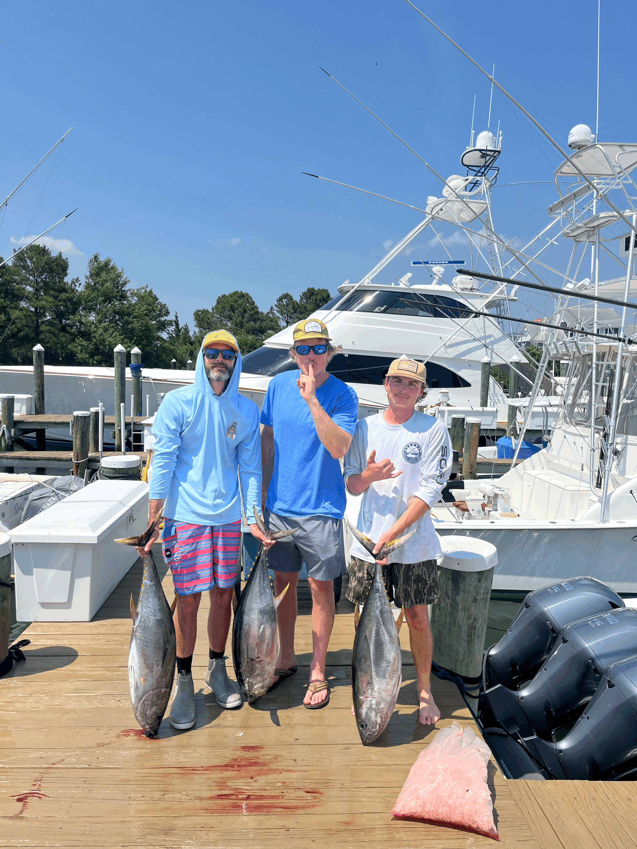 Well it was a beautiful morning to scout and prep for tunas and tiaras tomorrow and we did just that! Skeleton crew of Me(Taylor) Jeff and Alex, bite turned on around 8-9am got 4-5 bites only 3 fish came tight and all 3 were landed, and in the 30-40lb class with the last one 45-50lb, we had dense dense fog we were dealing with so only had our radar and chart plotter or structure to go off of, and our app of course! We found a nice little 1-2 degree break in 3-400 fathoms and plucked those 3 in 2 passes, trolled another 45 mins and decided to call it early around 1030-11 and save our energy for this weekend, but we must have been in Chris Little aka Talking Trash’s way, cause soon as we left he said it turned on for him and he ended up catching 14! Keep in mind he’s a tuna pro and has omni, but a good sign for the rest of us, I truly believe the fish were north of us in poormans as well on other parts of the same temp break, but the blue water in still outside the 100 line, the deeper you go the bluer it gets, but we had most of our luck closer to the Washington than the poormans in 200-400 fathoms, I’m sure this info is traveling fast, but try to keep it between us members and your close group of buddy boats or intel circle as we approach the tournament season!! Poormans and Washington are the move for now, but it will be a parking lot tomorrow between the good weather, good reports, and ladies tuna tourney. Tight lines and Stay Bent! We’ll update y’all how we do tomorrow, hoping and praying we get some decent ones really worth weighing in for the girls!!